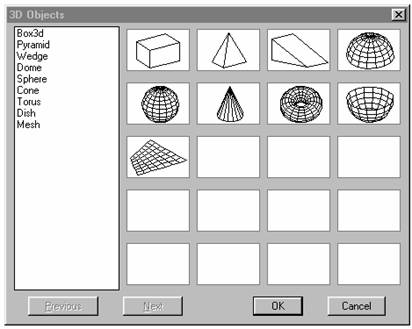 Meniul: DRAW Surfaces 3D Surfaces Command: 3D Box/Cone/Dish/DOme/Mesh/Pyramid/Shere/Torus/Wedge: daca comanda este accesata de la bara de meniu, pe ecran apare caseta de dialog din fig. 2 dupa alegerea suprafetei dorite, AUTOCAD solicita parametrii constructiei necesari pentru definirea completa a tipului de suprafata indicata. |