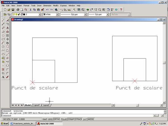 Pentru usurarea executarii desenelor este necesara crearea unui sistem de coordonate propriu (UCS). Acesta poate fi deplasat, redenumit, sters, restaurat, etc. Indiferent de pozitia lui, originea sa are coordonatele 0,0 relative.
