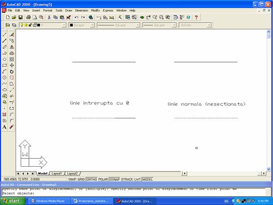 Unele comenzi necesita selectarea unor elemente ale desenului. Aceasta actiune este indicata prin schimbarea cererii Command: in Select object: si transformarea cursorului obisnuit, reticular in cursor tinta. Selectarea obiectelor se face prin deplasarea cursorului pe obiectul respectiv si apoi click stanga mouse. Elementul selectat va aparea cu linie intrerupta.
