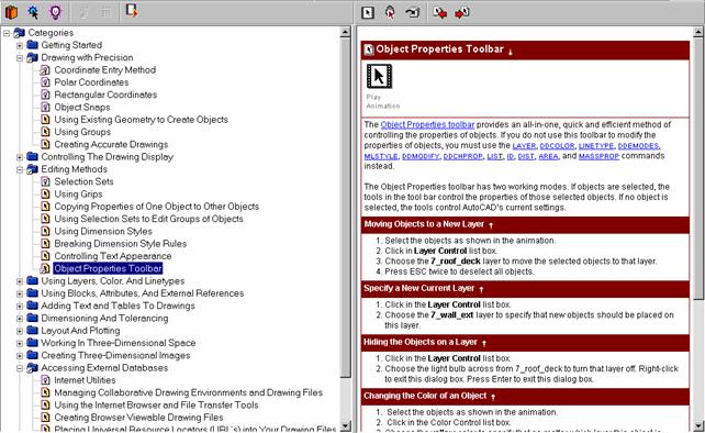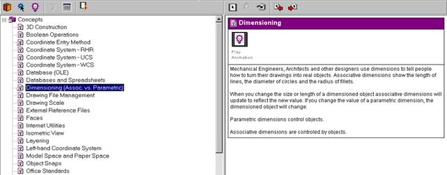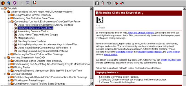 Utilizatorii mai vechi sau cei lipsiti de experienta, care au nevoie de mai multe informatii despre anumite functii sau instrumente, pot utiliza legaturile directe pentru a le accesa online. De asemeni, interfata Fast Answers va ajuta în rezolvarea problemelor tehnice pe masura ce lucrati. De exemplu, proiectantii care au probleme cu comanda PLOT sau cu stilurile de dimensionare, pot accesa imediat lectia relevanta. Puteti urmari comenzile si topica lor de la lectie la lectie, comanda cu comanda.