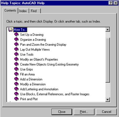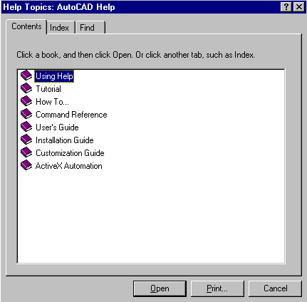 AutoCAD Help Topics - Noua caseta de dialog AutoCAD Help contine sectiunile Contents Index si Find, asa cum se prezinta în figura urmatoare. Puteti, de asemeni, accesa caseta de dialog AutoCAD Help si de la linia de comanda. Daca nu sunteti sigur de sintaxa corecta pentru a o accesa de la linia de comanda, sau sunteti în cadrul unei comenzi si nu sunteti sigur de pasul urmator, apasati tasta F1 pentru a deschide caseta de dialog AutoCAD Help