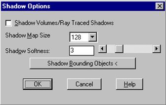 Shadows - Activeaza umbrele determinate de sursele de lumina definite de utilizatori. Umbrele sunt randate numai pentru acele surse de lumina care au activata optiunea Shadow On din caseta de dialog New Spotlight sau Modify Spotlight. Aceasta optiune lucreaza numai pentru randarile de tip Photo Real si Photo Raytrace