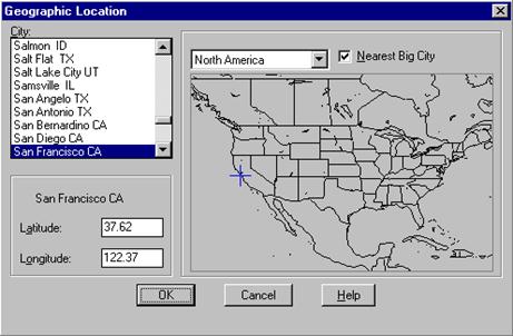 afisata caseta de dialog Geographic Location. Locatia implicita este setata pentru San Francisco,