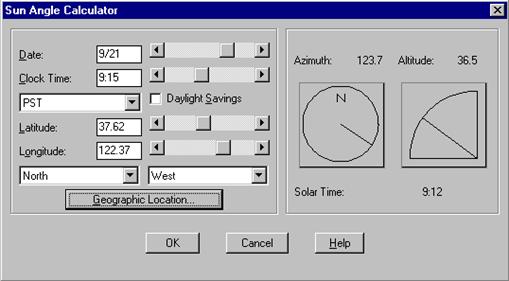 Selectati butonul Sun Angle Calculator. Va fi afisata caseta de dialog Sun Angle Calculator