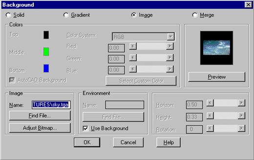 of Type si selectati *.tga. Apoi alegeti directorul acadr14 textures si selectati fisierul sky.tga. Caseta de dialog Background Image completata va arata
