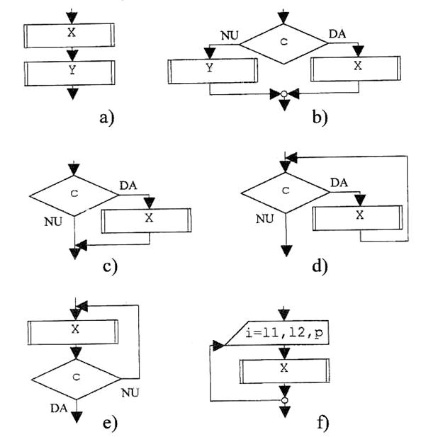 Structura WHILE-DO (figura d). La aceasta structura, secventa de prelucrare este executata repetat atata timp cat este indeplinita o anumita conditie. Din figura prezentata, structura se scrie WHILE c DO X, ceea ce ar insemna: "atata timp cat expresia logica c are valoarea adevarat executa secventa X". Practic, succesiunea operatiilor este urmatoarea: verifica expresia logica c si, daca este adevarata, executa secventa de instructiuni X dupa care reia ciclul cu verificarea expresiei c; daca c nu este adevarata atunci treci la secventa urmatoare, fara a mai executa X. Se poate observa ca secventa X poate sa nu fie executata deloc, daca in urma evaluarii expresiei logice rezultatul este fals. De asemenea, daca la prima evaluare a expresiei logice c rezultatul este adevarat, atunci, pentru ca secventa X sa nu se execute la infinit, trebuie ca ea sa cuprinda una sau mai multe operatii prin care valorile implicate in expresia c sa se modifice astfel incat aceasta sa poata deveni si falsa.