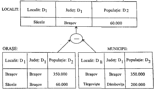 2. Diferenta. Reprezinta operatie din AR definita pe doua relatii: R1 si R2, ambele cu o aceeasi schemâ, operatia constând din construirea unei noi relatii R3, cu schema identica cu a operanzilor si cu extensia formata din acele tupluri ale relatiei R1 care nu se regasesc si în relatia R2.