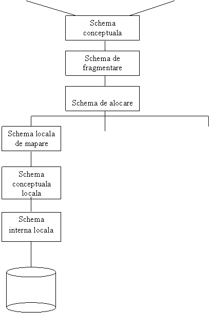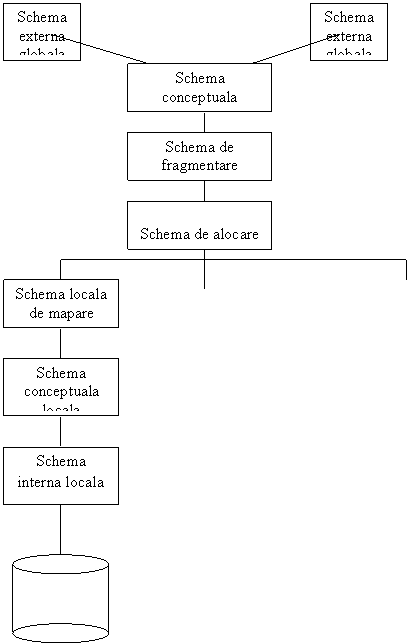 Arhitectura ANSI-SPARC pe trei nivele a unei baze de date distribuite este redata grafic in pagina urmatoare, Fig 7.1. Dam mai jos cateva explicatii referitoare la unele elemente prezente in schema: