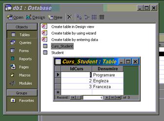 Daca veti dori dori sa lucrati împreuna cu noi pe parcursul lecturarii cartii, va propunem sa creati în modul Table Datasheet View tabela Curs, prezentata în figura. Ne va folosi în exemplele urmatoare.