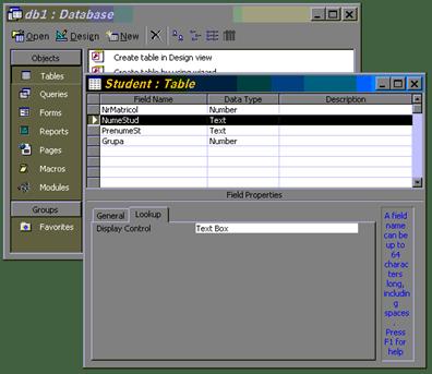 Va propunem ca, pe baza informatiilor prezentate în continuare, sa încercati sa creati tabela Student în Table Design View si apoi sa introduceti în ea date. Acesta va fi un exercitiu util si va va ajuta sa parcurgeti urmatoarele sectiuni.