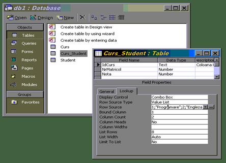 În continuare, vom descrie procedeul prin care valorile stocate în câmpul Curs al tabelei Curs_Student sa poata fi selectate dintr-o lista definita de dumneavoastra.