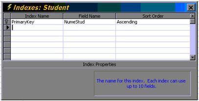 apasati butonul Indexes de pe bara de instrumente sau alegeti comanda View Indexes. Va aparea fereastra Indexes pentru tabela Student (fig.). Observati ca ea continde deja o intrare pentru cheia primara a tabelei, NrMatricol, deci exista un index de pe coloana NrMatricol, numit Primary Key.