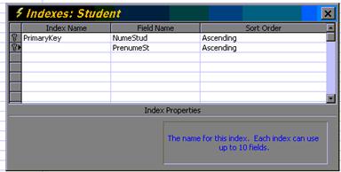 deoarece sortarea studentilor se va face dupa nume si prenume, vom crea si un index pe aceste coloane. Pentru aceasta, introduceti în primul câmp liber al coloanei Index Name denumirea indexului: sa-i spunem Nume.