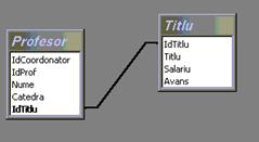 faceti clic pe câmpul IdTitlu din tabela Titlu si, tinand mouse-ul apasat, trageti câmpul peste câmpul IdTitlu din tabela Profesor.