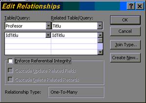 Access va da posibilitatea de a opta doar pentru inner join, left outer join sau right outer join. Pentru relatia Profesor/Titlu, alegeti în cutia de dialog Join Properties optiunea cu nunarul unu, inner join.