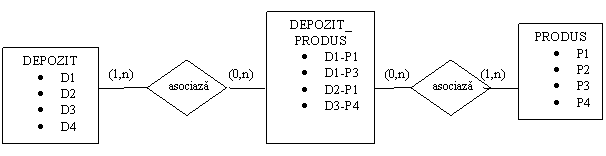 Exemplu: În cazul exemplului de mai sus (vezi figura 2.8), transformarea asocierii „multi la multi” în asocieri de tipul „unu la multi” se poate realiza prin construirea unei noi entitati DEPOZIT_PRODUS astfel:
