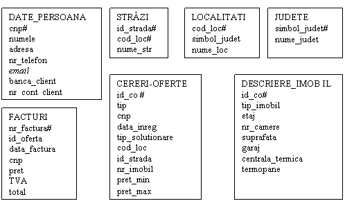 Pentru baza de date din domeniul imobiliar considerata anterior, se pot pune în evidenta urmatoarele entitati: