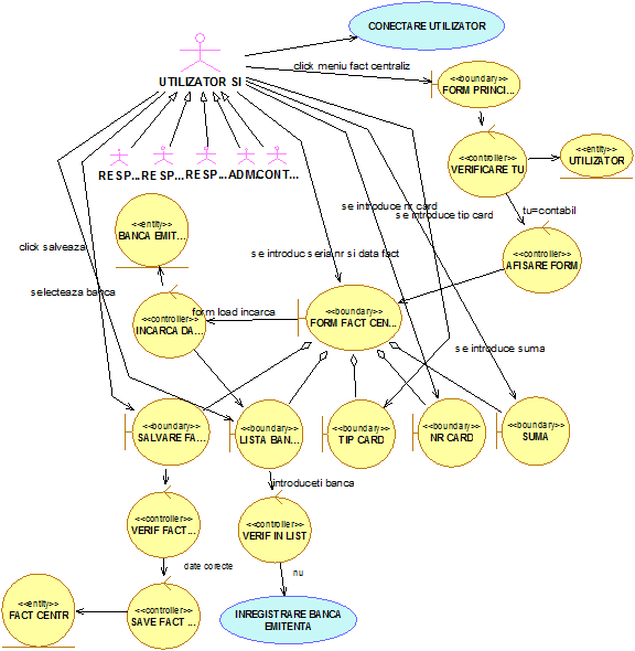 Se introduc numarul,seria si data facturii centralizatoare.Se selecteaza dintr-o lista banca emitenta. Se introduc tipul cardului, numarul cardului si suma platita. S I afiseaza valoarea totala a facturii fara TVA, cu TVA si valoarea totala a TVA. Se face click pe butonul „salveaza factura centralizatoare”.