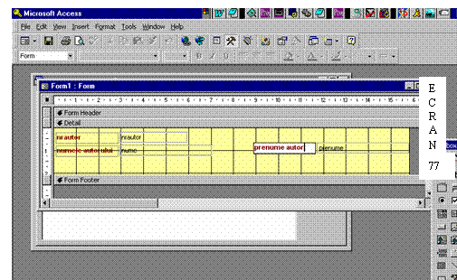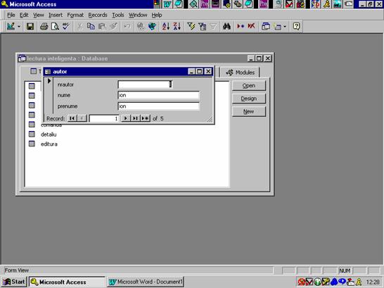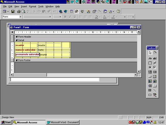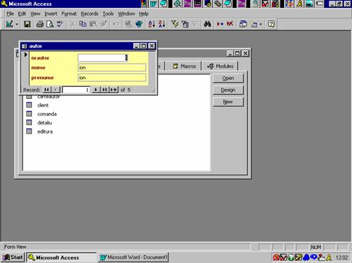 puse in evidenta cele trei componente; se poate observa ca la ‘nrautor’ nu putem face modificari (restrictia de domeniu). Mai vedem in josul formularului, ca avem numarul de inregistrare si putem sa trecem la inregistrarea urmatoare sau precedenta, la ultima sau la prima inregistrare, sau putem sa cream o noua inregistrare.