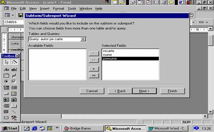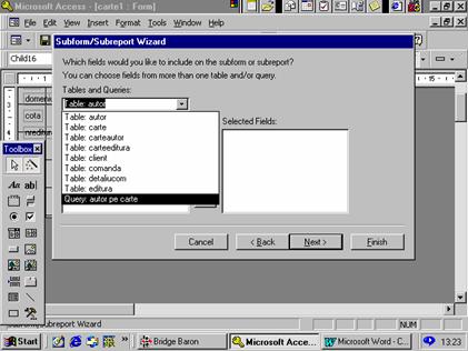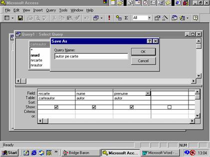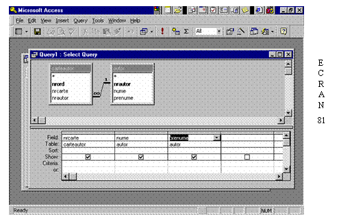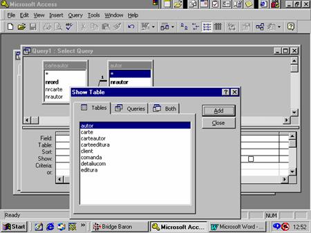 Aici ‘Add’-adaugam ‘carteautor’ si ‘autor’ si din ele selectam, prin metoda cunoscuta, campurile ‘nrcarte’, ‘nume’, ‘prenume’ si obtinem:
