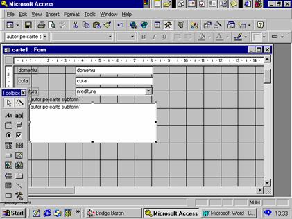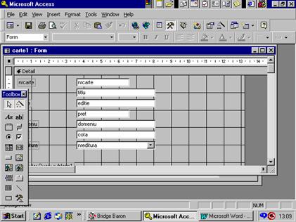 Apoi reluam proiectarea formularului ‘carte’ (in dosar, la formulare selectam ‘carte’ si apasam <design>). Se obtine: