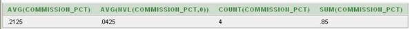 SELECT AVG(commission_pct), AVG(NVL(commission_pct,0)),