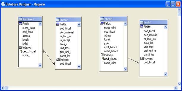 In aplicatia Evidenta_magazie tabelele Furnizori si Clienti sunt tabelele de la care se porneste legatura catre tabelele Intrari si Iesiri. (Figura