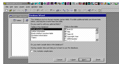 Pe partea dreapta apar atributele pntru entitatea selectata (atributele scrise inclinat sunt atribute optionale). O sa vrem sa cream o baza de date cu date deci vom face “clic” pe <Yes, include sample data>. O sa vedem cum pot fi modificate toate acestea, dar pentru moment sa mergem mai departe apasand <Next>.