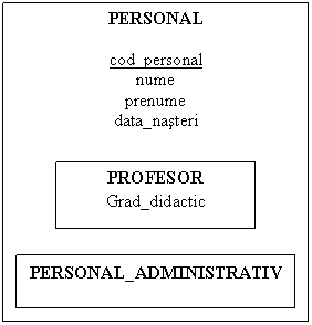 o Subentitatile devin subtabele adica tabele a caror cheie primara este cheia straina pentru tabelul superentitate. De exemplu, cheia primara a tabelului PROFESOR este „cod_personal”, care este cheie straina care face referinta la cheia primara „cod_personal” din tabelul PERSONAL.