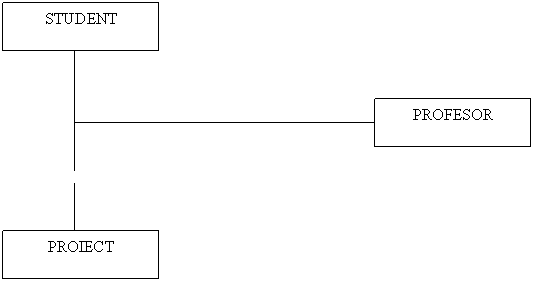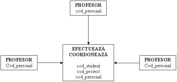 o O relatie de tip 3 (relatie intre mai mult de doua entitati) devine un tabel asociativ care are cate o cheie straina pentru fiecare dintre tabelele asociate; cheia primara este compusa din aceste chei straine plus eventual alte componente aditionale. De exemplu, tabelul reprezentat in figura 2.3 exprima relatia „efectueaza_coordoneaza” dintre STUDENT, PROIECT si PROFESOR. In acest cheia primara este combinatia cheilor straine corespunzatoare celor trei entitati.