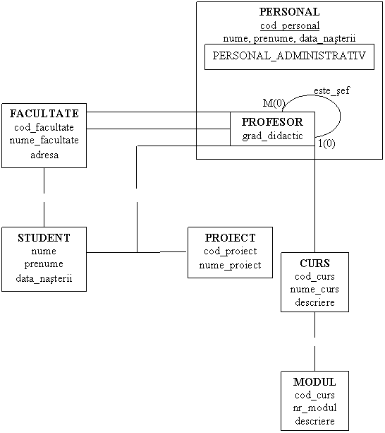 STUDENT Cod_student Nume Prenume Dara_nasteri PROFESOR Cod_profesor Nume Prenume Data_nasteri Grad_didactic FACULTATE Cod_facultate Nume_facultate adresa