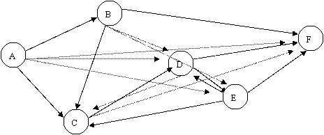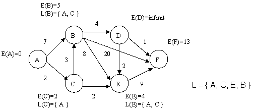 se calculeaza etichetele pentru nodul F care este vecinul direct al nodului E, E(F)=13. Dintre toate etichetele, cea a nodului are valoarea minima, 5, si cum el nu este în L, este pus în aceasta lista, deci L = . În lista predecesorilor sai sunt pusi predecesorii nodului de la care s-a ajuns la B, adica ai nodului C, si acesta din urma, L(B) = ;