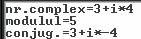 Functia cabs() calculeaza modulul numarului complex. Functia conjg() conjuga numarul complex. Functia print() afisaza pe ecran numarul complex.