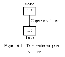 Fiecare argument efectiv utilizat la apelul functiei este evaluat, iar valoarea este atribuita parametrului formal corespunzator. În interiorul functiei, o copie locala a acestei valori va fi memorata în parametrul formal. O modificare a valorii parametrului formal în interiorul functiei (printr-o operatie din corpul functiei), nu va modifica valoarea parametrului efectiv, ci doar valoarea parametrului formal, deci a copiei locale a parametrului efectiv (figura 6.1.). Faptul ca variabila din programul apelant (parametrul efectiv) si parametrul formal sunt obiecte distincte, poate constitui un mijloc util de protectie. Astfel, în functia f1, valoarea parametrului formal intr este modificata (alterata) prin instructiunea ciclica for. În schimb, valoarea parametrului efectiv (data) din functia apelanta, ramâne nemodificata.