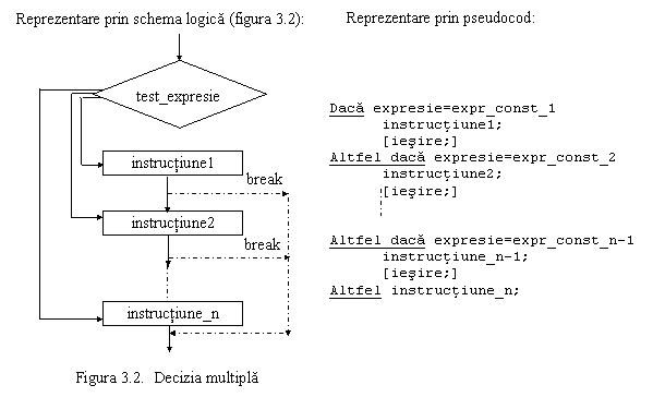 Se testeaza daca valoarea pentru expresie este una dintre constantele specificate expr_const_1, expr_const_2, etc.) si se executa instructiunea de pe ramura corespunzatoare. În schema logica test_expresie este una din conditiile: expresie=expr_const_1, expresie=expr_const_2, etc.
