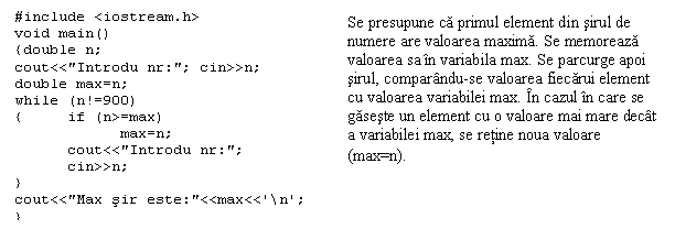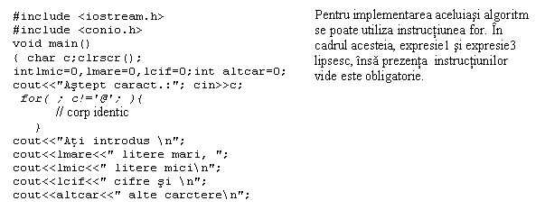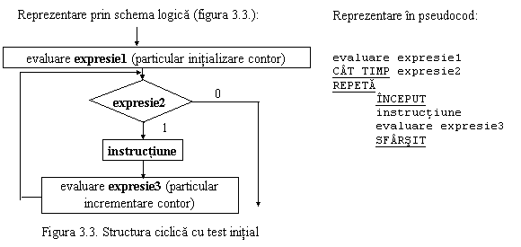 Structura ciclica cu test initial este implementata prin instructiunile while si for