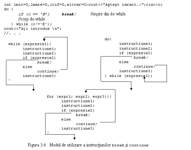 Asa cum se observa din figura 3.4., utilizata în cadrul instructiunilor ciclice, instructiunea break "forteaza" iesirea din acestea. Fara a se mai testa valoarea expresiei (conditia) care determina repetarea corpului instructiunii ciclice, se continua executia cu instructiunea care urmeaza instructiunii ciclice. Astfel, se întrerupe repetarea corpului instructiunii ciclice, indiferent de valoarea conditiei de test.