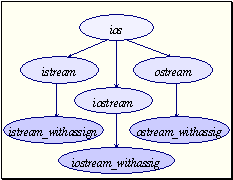 Pentru ca nu exista instructiuni de intrare/iesire, s-au definit functii (in C), respectiv doua ierarhii de clase (in C++). Aceste doua ierarhii (reprezentate in figurile de mai jos si declarate in fisierul iostream.h) realizeaza operatiile de intrare/iesire prin stream-uri (flux de date sursa destinatie