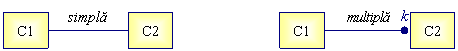 Asociatie relatie de cooperare intre clase - corespunzatoare unui verb oarecare din specificatie, diferita de relatia parte-intreg (de exemplu relatia Student - Facultate). Relatia corespunzatoare dintre obiecte apartinand unor clase asociate se numeste legatura. O asociatie poate fi simpla sau multipla (daca un obiect asociant este pus in legatura, de exemplu prin pointeri, cu mai multe obiecte asociate, de acelasi tip). Aceasta relatie se reprezinta grafic (dupa metodologia OMT) in plan orizontal astfel: