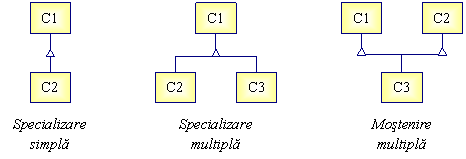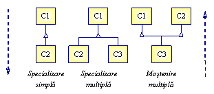 Specializare (generalizare, mostenire) - relatie prin care sunt pastrate (mostenite) caracteristicile unei clase (de baza) si sunt adaugate diferentele specifice, formand o noua clasa (derivata). Mostenirea permite reutilizarea de cod definit in clasa de baza (superclasa) si in noua clasa (sublasa). Deci, o subclasa este o specializare a unei superclase (verbul caracteristic fiind a fi), iar o superclasa este o generalizare a unei subclase. Aceasta relatie este tranzitiva, iar structura formata de multimea clas 848g69i elor aflate in aceasta relatie (construita pe verticala) se numeste ierarhie de clase. Atat specializarea cat si mostenirea poate fi simpla sau multipla, reprezentarea facandu-se in plan vertical astfel: