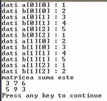 Problema 10. Sa se scrie un program care sa calculeze suma a doua matrici A si B si cu doua linii si trei coloane fiecare. Elementele matricelor se vor citi de la tastatura. Dacǎm notǎm prin C matricea suma, algoritmul de calcul este urmatorul.