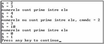 Problema 12. Sa se scrie un program care sa testeze daca doua numere intregi sunt prime intre ele. Programul va citi repetat seturi de doua numere intregi de la tastatura pana cand primul numar citit este zero. Programul este urmatorul.