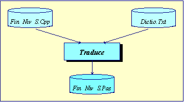 Urmatorul program inlocuieste cuvintele din fisierul F_Niv_S.Cpp aflate in partea stanga a dictionarului Dictio.Txt cu cele corespunzatoare din partea dreapta, rezultatul fiind depus in fisierul F_Niv_S.Pas, asa cum se poate vedea in schema de mai jos.