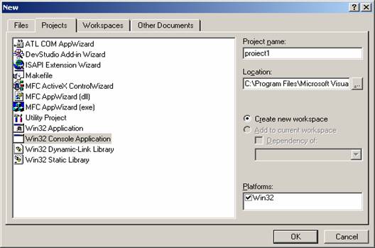 In sectiunea Projects se selecteaza optiunea Win32 Console Application, iar in caseta de text Project name se introduce numele proiectului, care va fi numele directorului corespunzator proiectului.