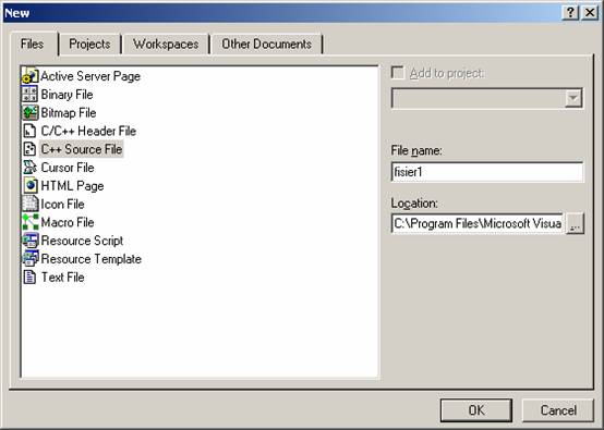Se creaza fisierele sursa. Se selecteaza din nou caseta de dialog cu optiunea New a meniului File, de data aceasta cu sectiunea Files. Pentru a crea un fisier sursa tip C++ se selecteaza optiunea C++ Source File, iar in caseta de text File name se introduce numele fisierului sursa, ca in figura 1.2.