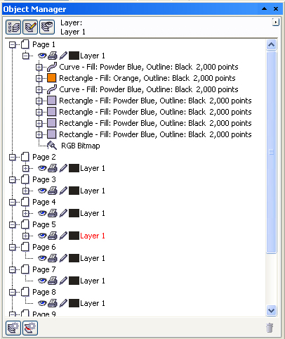 4 Object Manager este una din cele mai utilizate ferestre. Aceasta prezinta numarul de pagini, obiectele si proprietatile acestora. Fiecare obiect poate fi editat direct din aceasta fereastra. Utilizand aceasta fereastra se poate naviga mult mai usor prin document si de aceea este cel mai des utilizata in cazul documentelor voluminoase ca informatie.
