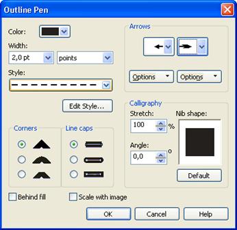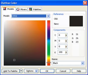 Outline Tool (Linie de contur) este unul din cele mai importante instrumente utilizate in grafica vectoriala. Exista o caseta specifica liniei de contur care cuprinde grosimi standard ale acesteia, posibilitatea de a stabili grosimea, texturi, stabilirea culorilor. Stabilirea culorii se poate realiza pentru linia de contur si dand un clic dreapta pe bara de culori de pe suprafata de lucru.