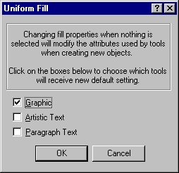 Modificarea atributului implicit de umplere.Daca nu s-a selectat nici un obiect si s-a activat instrumentul Fill, va apare cutia de dialog din figura de mai jos. In aceasta cutie de dialog se precizeaza caror obiecte li se va aplica modificarea: obiectelor de tip grafic, Artistic Text sau textului te tip paragraf, Paragraph Text. Odata apasat butonul Ok, va apare fereastra de dialog de unda va puteti alege atributele de umplere dorite. Modificarile facute devin implicite, astfel ca toate obiectele care vor fi desenate in continuare vor fi desenate cu modul de umplere ales.