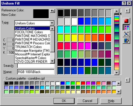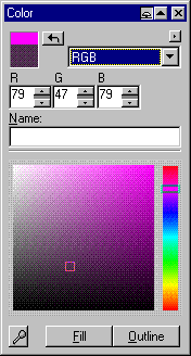 Apasand pe lista derulanta unde vedeti scris RGB (Rosu Verde Albastru) puteti alege paleta de culori. Daca apasati butonul Fill culoarea aleasa va fi folosita pentru umplerea obiectului, iar daca apasati butonul Outline, culoarea va fi folosita pentru a colora conturul obiectului.