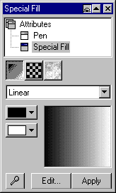 Fiecare din cele cinci moduri de umplere poate fi activat apasandu-se pe butonul corespunzator din meniul instrumentului Fill. Dar ele pot fi la indemana si daca activam cele doua meniuri flotante Color si Special Fill. Din aceste meniuri la indemana, se pot alege toate modurile de umplere, cu observatia ca pentru a folosi meniul Color trebuie intai sa selectam un obiect. Sfatuim utilizatorul incepator sa foloseasca pentru inceput aceste meniuri, datorita usurintei in folosire.